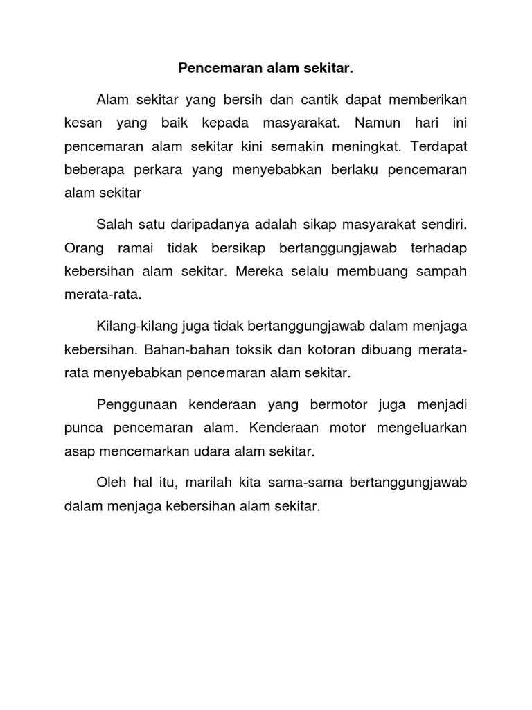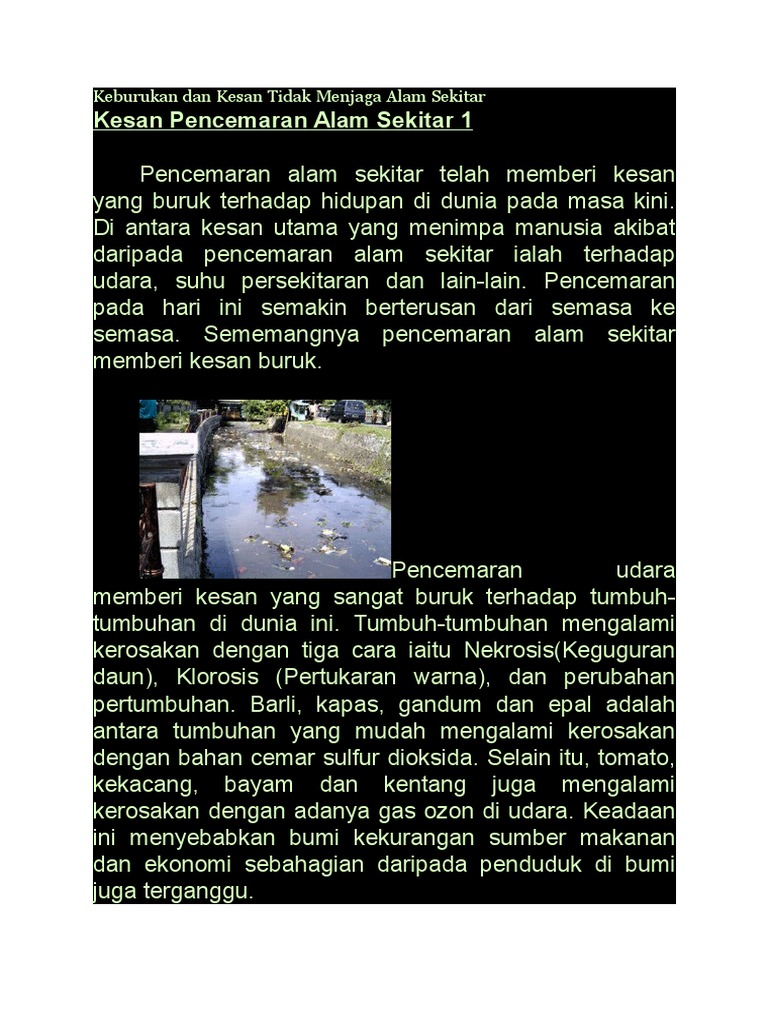 Contoh Karangan Kesan Pencemaran Alam Sekitar from tse1.mm.bing.net Pencemaran sungai mempengaruhi kehidupan makhluk hidup yang ada di dalamnya. Dimana antara kesan yang dianggap kronik akaibat pencemaran air yang berlaku adalah anomalia, iaitu pembesaran tubuh dan tingkahlaku yang tidak normal, serta kurang daya ketahanan badan. Punca bronkitis punca asma punca kerosakan mental punca kanser dan mutasi ganggu saluran pernafasan dan mata punca penyakit seperti kolera dan tifoid kehilangan sumber ekonomi kehilangan sumber alam (pemusnahan hutan) kehilangan. Pencemaran alam sekitar boleh didefinisikan sebagai sesuatu perkara yang mengotorkan alam pencemaran radiasi tersebut meninggalkan kesan jangka yang panjang terhadap masyarakat. Dua pembolehubah alam sekitar (rumah yang terletak kurang daripada 200 meter dan rumah yang terletak di antara 200 dan 500 meter di sepanjang tebing. Kesedaran kepada manusia terhadap pentingnya alam sekitar yang selamat diwujudkan dengan hasil tulisan racheal carson yang bertajuk 'silent spring'(1962). Berpunca daripada aktiviti manusia yang tidak bertanggungjawab. Pencemaran sungai dapat membuat makhluk hidup didalam sungai mati karena habitatnya telah tercemar.